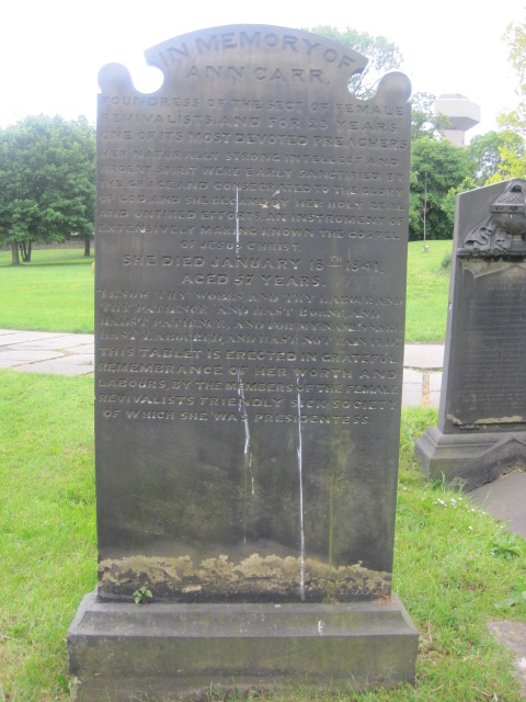 THIS TABLET IS ERECTED IN GRATEFUL REMEMBRANCE OF HER WORTH & LABOURS, BY THE MEMBERS OF THE FEMALE REVIVALISTS’ FRIENDLY SICK SOCIETY OF WHICH SHE WAS PRESIDENTESS.